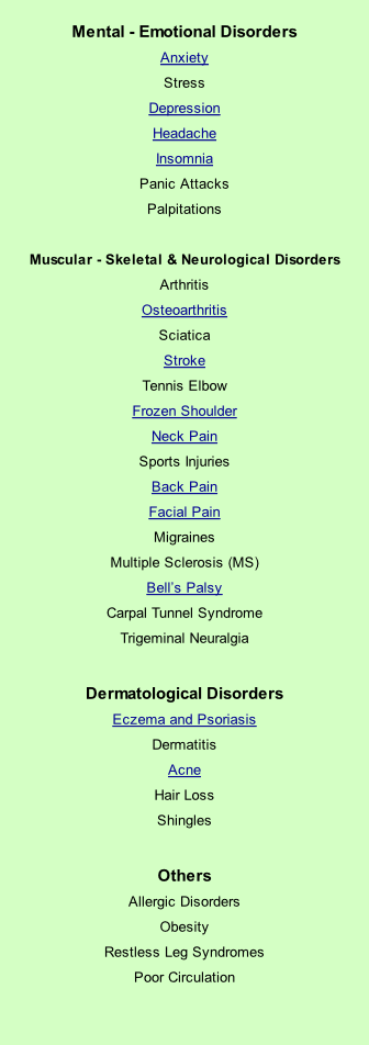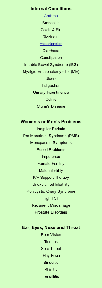 The list below shows conditions which are commonly treated by acupuncture and Chinese herbal medicines. Some of these conditions (underlined in blue) are linked to the relevant Research Fact Sheets produced by the British Acupuncture Council, which provide summaries of research and how acupuncture may be beneficial. This list is by no means comprehensive. If you want to discuss whether the treatment through Traditional Chinese Medicine (TCM) would be appropriate or suitable for your specific conditions, please call us on 01582 618731.